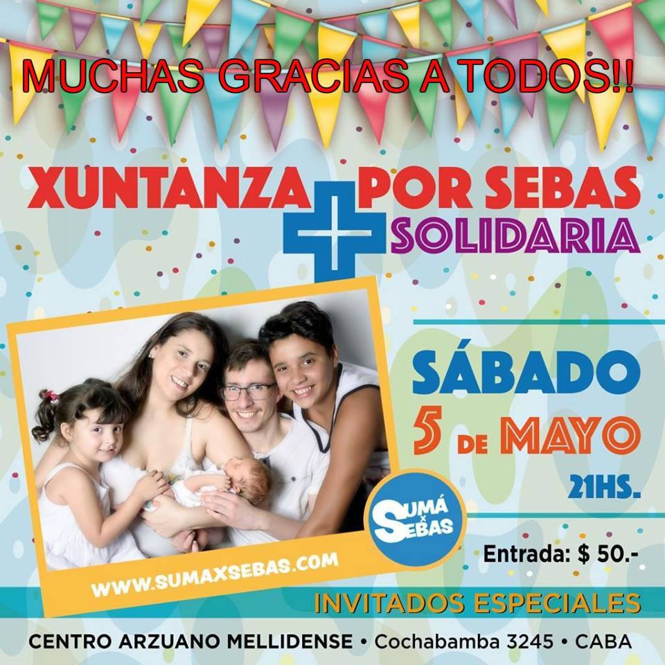El sábado 5 de Mayo participamos de la Xuntanza Solidaria organizada por el Centro Arzuano Mellidense (CAM) con el fin de recaudar el dinero necesario para que Sebastián Pumar (integrante del CAM), quien padece esclerósis múltiple, pueda realizar un tratamiento médico en Cuba. Aún no se consiguió el 100%, todavía estás a tiempo de ayudar!